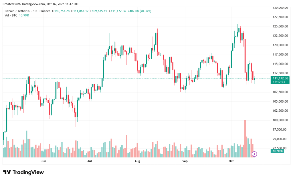 В моменте котировки первой криптовалюты снижались до ~$109 800. Коррекция последовала за крупнейшей в истории крипторынка ликвидацией позиций на сумму свыше $19 млрд за прошлые выходные.